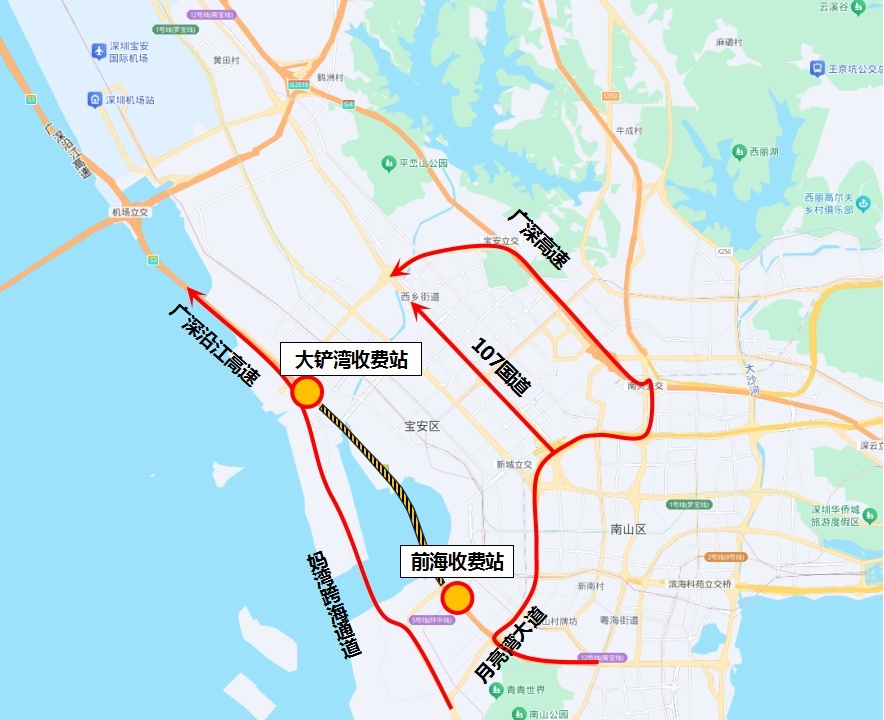 从深圳湾片区出发的,可改沿月亮湾大道经107国道或转广深高速绕行。
