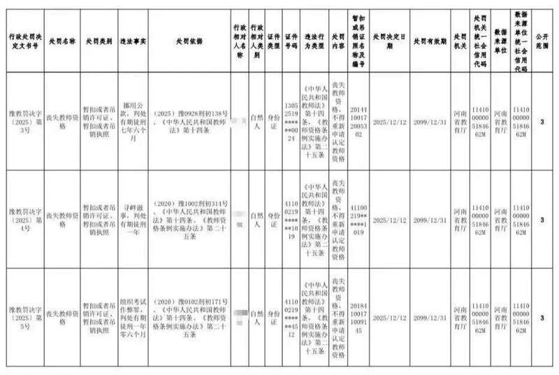 河南省教育厅近日发布《2025年撤销高校教师资格行政处罚》的通报,依法对五名高校教师作出丧失或撤销教师资格的处理。其中,两人因违反师德师风被撤销资格,三人因触犯刑法被剥夺资格。