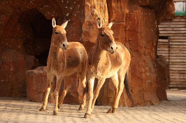 它们是在郑州市动物园为迎接马年到来特意引进的,是国家一级保护动物——俗称野驴、亚洲野驴,是奇蹄目马科马属哺乳动物。其外形似骡,善于奔跑,极耐干旱,可以数日不饮水;身形高大、有着黑白条纹的斑马是郑州市动物园的老“居民”,历经几代繁衍已形成优势种群,随着马年的到来再度“走红”。